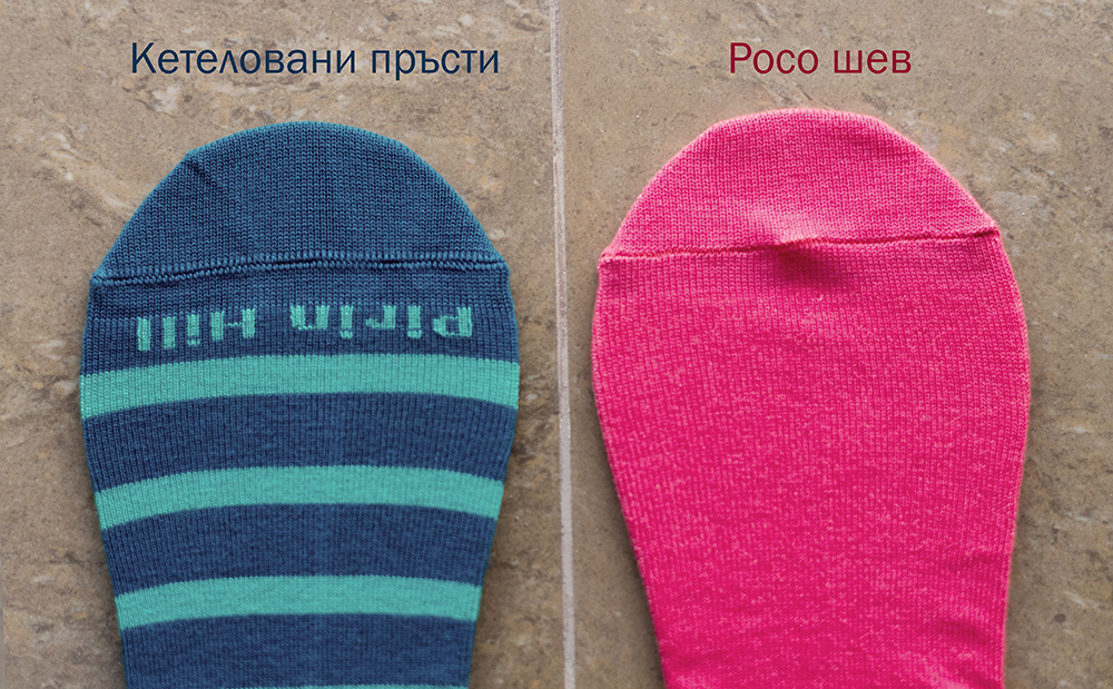 Друго предимство, с което се отличават чорапите Pirin Hill, са ръчно кетелованите пръсти. Шевът е плосък и много по-фин от обикновен шев на оверлог машина. По този начин затварянето на пръстите е гладко, без ръб. Ето и разликата между ръчно кетеловани пръсти и оверлог:
