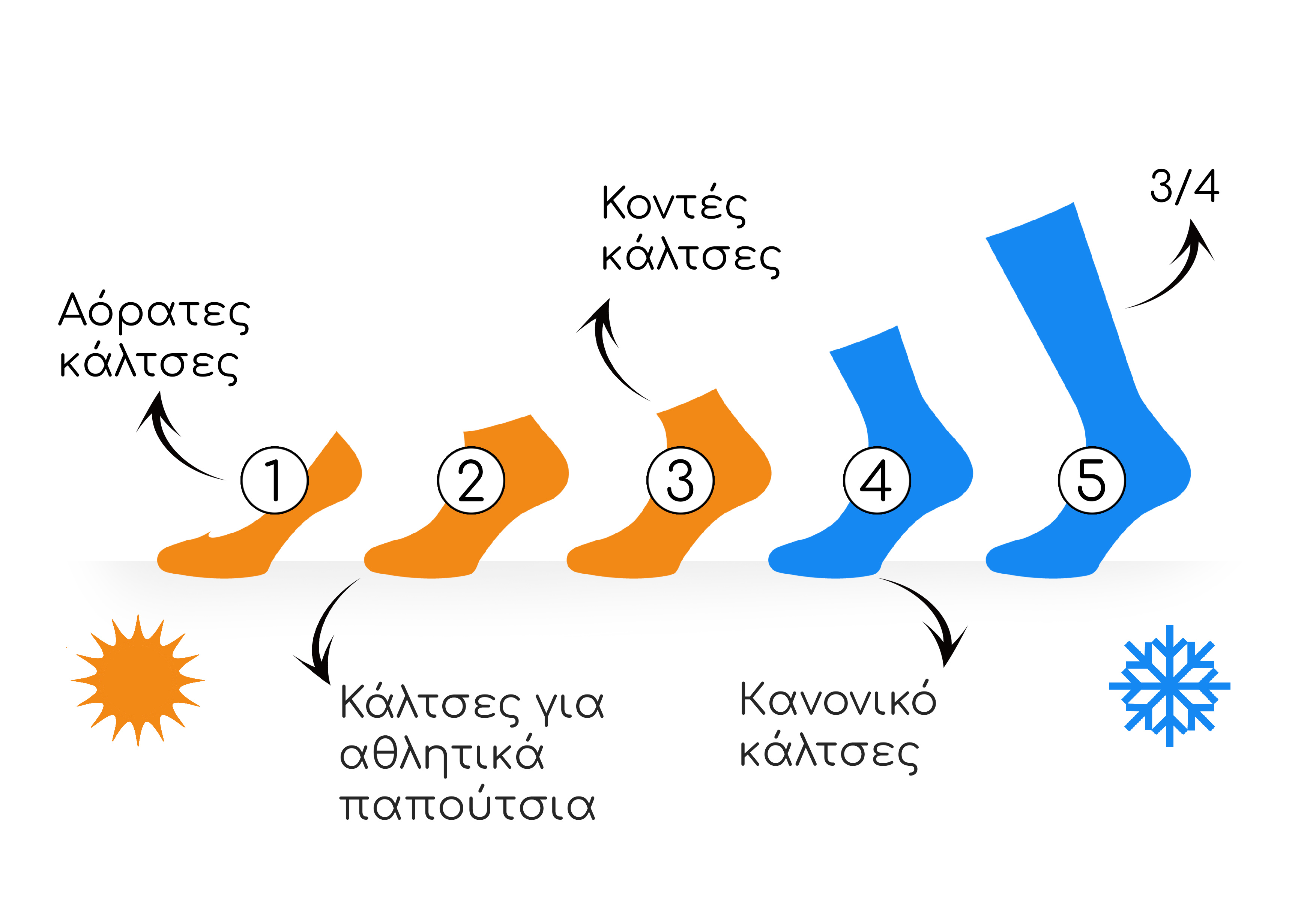 Αρχικά, ας ξεκινήσουμε με τα διαφορετικά μήκη των καλτσών. Υπάρχουν 5 τύποι, 3 από τους οποίους είναι κατάλληλοι για ζεστό καιρό - "αόρατες κάλτσες", "κάλτσες αθλητικών παπουτσιών" και "κοντές κάλτσες". Στο σχήμα μπορείτε να δείτε τα 5 είδη μήκους και ποια είναι κατάλληλα για το καλοκαίρι. Οι 3 πρώτοι τύποι είναι αυτοί που θα γίνουν ο καλύτερος φίλος των ποδιών σας για το καλοκαίρι.